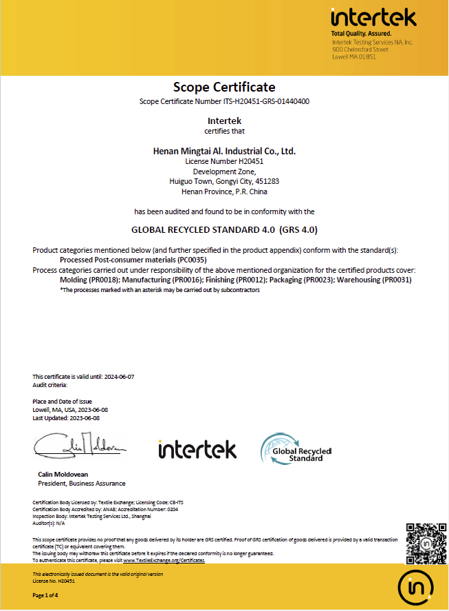 近日,河南明泰铝业股份有限公司顺利通过“GRS全球回收标准”认证审核,取得GRS4.0标准证书。
